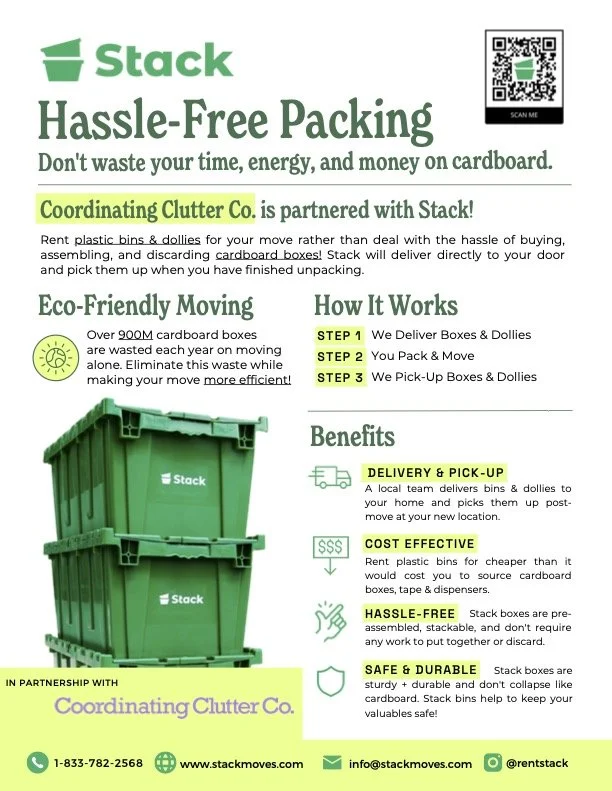 Hey there! I wanted to share some exciting news. Coordinating Clutter Co. and Stack have partnered together to ensure you have a hassle-free move. With their combined expertise, you can count on a smooth and organized transition to your new place. Say goodbye to moving stress and hello to a seamless moving experience!